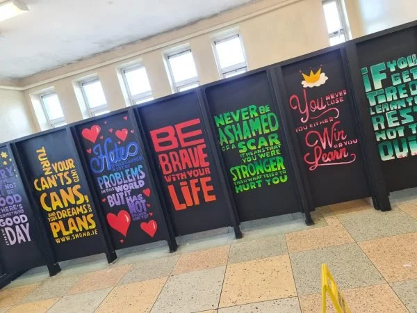 Be as creative as you like, some schools have even used the stencils to create giant murals in their hallways, reception areas and outside walls. The possibilities are endless! Our friends in Heywood Community School used our stencils and the pictures in this post are from the bathrooms in their school!